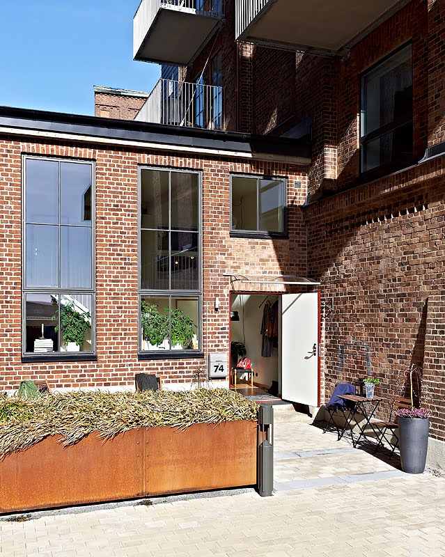 Den här entrén borde man ju bara bli glad av att komma hem till. Man tror knappt att detta kan vara i Sverige, mer Amsterdam eller så.
